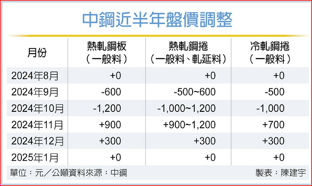中國大陸最大鋼廠寶鋼開出2月盤價,其中除少部分商品小漲外,其餘主力產品皆維持平盤,國內的中鋼近日也將開盤,據了解同樣開平盤的機會大。中鋼內部表示,近期市場需求平淡,且接近農曆新年,不太可能漲價,不過也沒有跌價空間,因此開平盤成為合理選項。 過去寶鋼多在每月10日開出下個月的新盤價,不過可能是因應這次農曆春節較早,這次提前在6日晚間開出2月盤價,包括熱軋、厚板、酸洗、普冷等主力產品都維持平盤。業者認為,寶鋼開平盤主要是評估大陸中央祭出宏觀政策利多可支撐鋼價,且下游業者庫存水位低,具備補庫需求,不過隨即將遇到農曆春節,買氣恐遞延到年後,因此以平盤因應。 業者表示,寶鋼想撐住鋼價的意味非常明顯,特別是當前環境多空交雜的狀況下,以不變應萬變才是最理想的做法。業者分析,1月有農曆春節,2月又進入季節淡季,買氣不容易提升,即便有政策利多,但整體大環境形勢不明朗,美國總統川普上任後會有哪些政策也還不確定,寶鋼也想先看川普會出什麼招,再考慮因應措施。 而中鋼近期也將開出2月盤價,據了解開平盤機會最大。中鋼高層表示,農曆年前買氣低,國內客戶補庫的意願並不高,因此不太可能漲價,此時就算降價恐怕也難以吸引下游買盤,加上成本沒有太多降價空間,因此新盤最大可能就是開平盤。